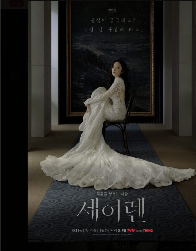ポスタービジュアルでは、主演のパク・ミニョンさんが白いマーメイドドレス姿で登場。裾のデザインは、人魚を思わせタイトルの「セイレーン」を印象付けているようにも感じます。