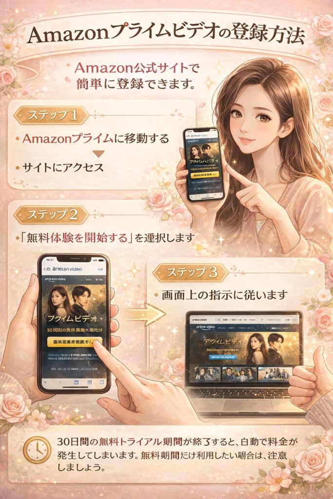 Amazonプライムビデオの登録方法は、Amazon公式サイトで簡単に登録できて、初めて利用する方は、30日間の無料トライアルが利用できます!