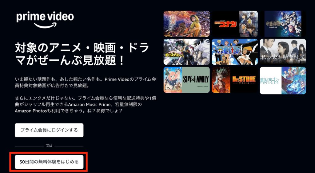アマプラでは、30日間の無料体験が用意されています。初めて利用する方であれば、対象作品を無料で楽しむことができます!